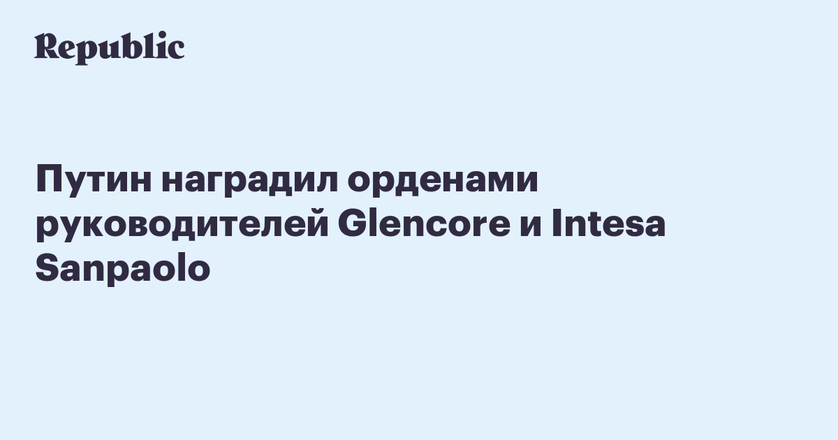 Президент России Владимир Путин наградил руководителей сырьевого трейдера Glencore, банка Intesa Sanpaolo и Суверенного фонда Катара. Соответствующий указ опубликован 10 апреля на официальном интернет-портале правовой информации.