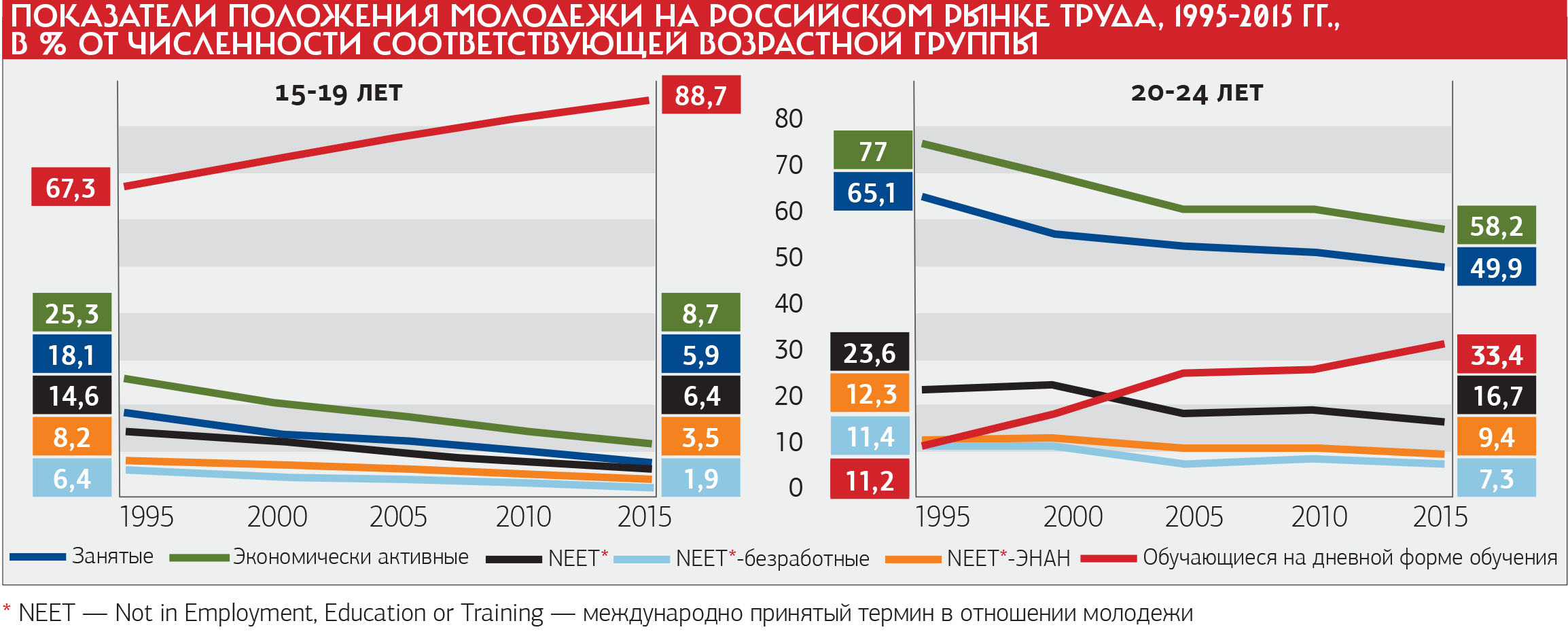 В России, и это тоже еще одно опровержение мифа, достаточно много работают: по доле экономически активного населения в общем трудоспособном населении РФ сравнима со странами Скандинавии, мировыми рекордсменами по доле трудящихся, и на 5–7 процентных пунктов превышает большинство стран Европы. В основном это эффект высокой женской занятости, что, однако, не компенсируется низким в сравнении с мировым пенсионным возрастом для женщин. Наконец, эта рабочая сила весьма динамична: число ежегодно меняющих регион работы в России оценивается в 6 млн человек (это около 8–9% от общего числа экономически активных людей), из которых 3,5 млн переезжают в другой регион не временно, а на срок более 9 месяцев. Ранее приводившиеся в российских исследованиях данные неоднократно показывали: Россия не имеет культуры «пожизненного найма» и длинных карьер, люди здесь меняют работу охотно. А вот с рабочими местами, констатируют в ВШЭ, все происходит совсем не так, как хотелось бы. Обычно в развитых и развивающихся экономиках в год создается 10–15% новых рабочих мест и столько же исчезает. В России этот показатель сильно колеблется, однако он всегда ниже развитых стран — 8–9%, причем легкость смены в стране юрлиц, видимо, требует дополнительно снизить эту оценку.