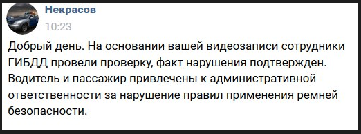 Позднее ему пришел ответ из ГИБДД о том, что на основании заявления была проведена проверка. Факт нарушения подтвердили, а водителя и пассажира привлекли к ответственности.