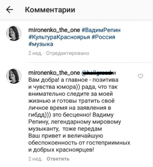 В видео, размещенном в сети 28 марта, краевой министр культуры, сидя в автомобиле, с улыбкой рассказывает о выступлении Репина в рамках Транссибирского Арт-Фестиваля.