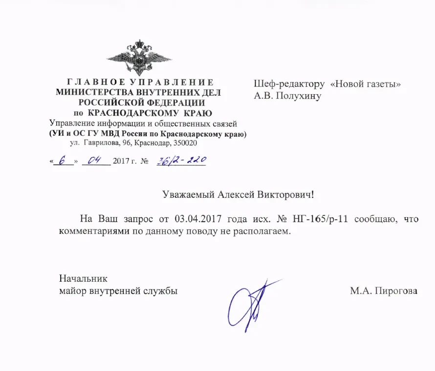 После выхода публикации мы направили официальный запрос в ГУ МВД Краснодарского края, чтобы узнать: удалось ли полиции установить личности провокаторов, в частности, тех, кто бросил в толпе дымовую шашку. Мы получили предельно лаконичный ответ: «Комментариями по данному поводу не располагаем».