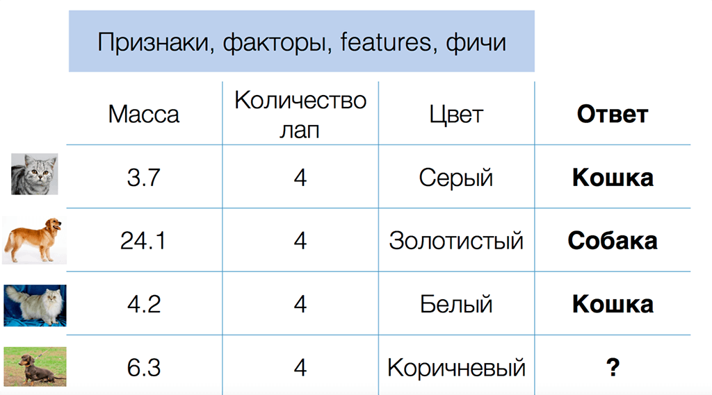 - Обучение с учителем. Например, по условиям задачи есть два объекта: кошка и собака, и машина должна по фотографии научиться различать, кто есть кто. Для этого у машины должна быть обучающая выборка, которая насчитывает тысячи объектов. У каждого объекта есть признаки (масса тела, цвет окраса, количество лап) и график распределения этих признаков. Машина в итоге создает оптимальный алгоритм различения. Это пример классической задачи для машинного обучения.