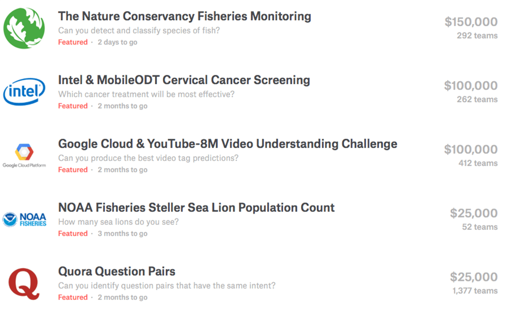 Если у вас есть задача по анализу данных, то лучше всего провести конкурс и привлечь к себе талантливых специалистов. История соревнований по анализу данных началась в 2000 году. Инвестор Роб МакЭван выложил в открытый доступ онлайн-базу по существующим местам добычи золота и пообещал 575.000 $ команде, которая выберет правильное место для нового золотого прииска. Лучшие команды геологов боролись за приз, и через год Роб заработал 3 млрд. долларов на найденном прииске.