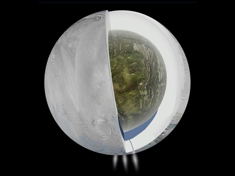 Поверхность Энцелада покрыта льдом. Ученые давно заподозрили, что этот лед скрывает океан. Впервые такая гипотеза была высказана в 2005 году, когда зонд «Кассини» обнаружил близ южного полюса спутника особые формы рельефа из чередующихся борозд и кряжей, получившие название «тигровые полосы». Позднее каждая из таких полос получила собственное имя: Александрия, Багдад, Каир и Дамаск. Лед в них, по данным спектрального анализа, оказался более молодым и отличающимся по составу от льда на остальной поверхности Энцелада. Также «Кассини-Гюйгенс» отметил наличие на Энцеладе криовулканов – мощных гейзеров, бьющих из-подо льда. По данным масс-спектрометрии, более 90 % их составляла вода.
