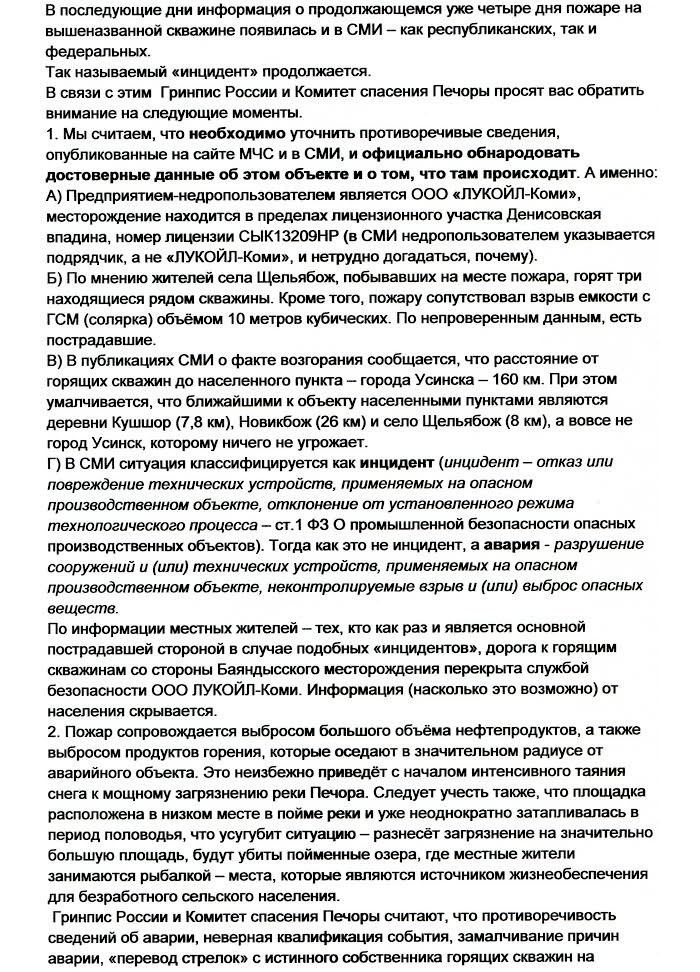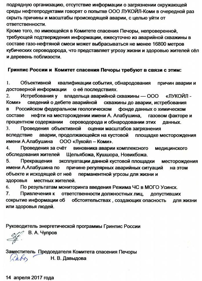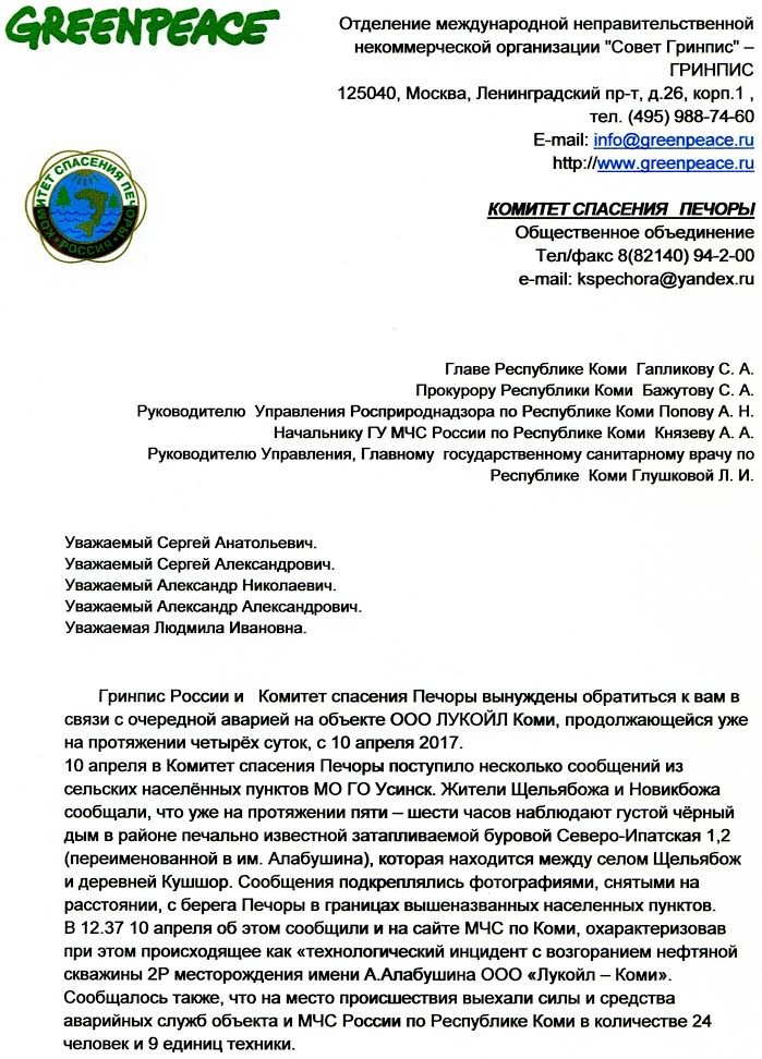 Комитет спасения Печоры совместно с «Гринпис России» отправили обращение главе Коми Сергею Гапликову, прокурору республики Сергею Бажутову, руководителю управления республиканского Росприроднадзора Александру Попову, начальнику ГУ МЧС по Коми Александру Князеву и главному государственному санитарному врачу республики Людмиле Глушковой.