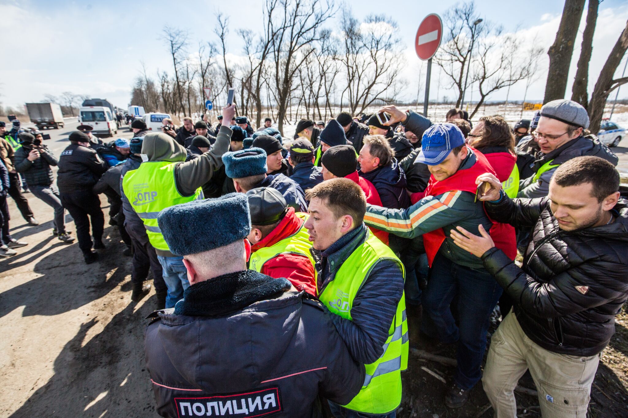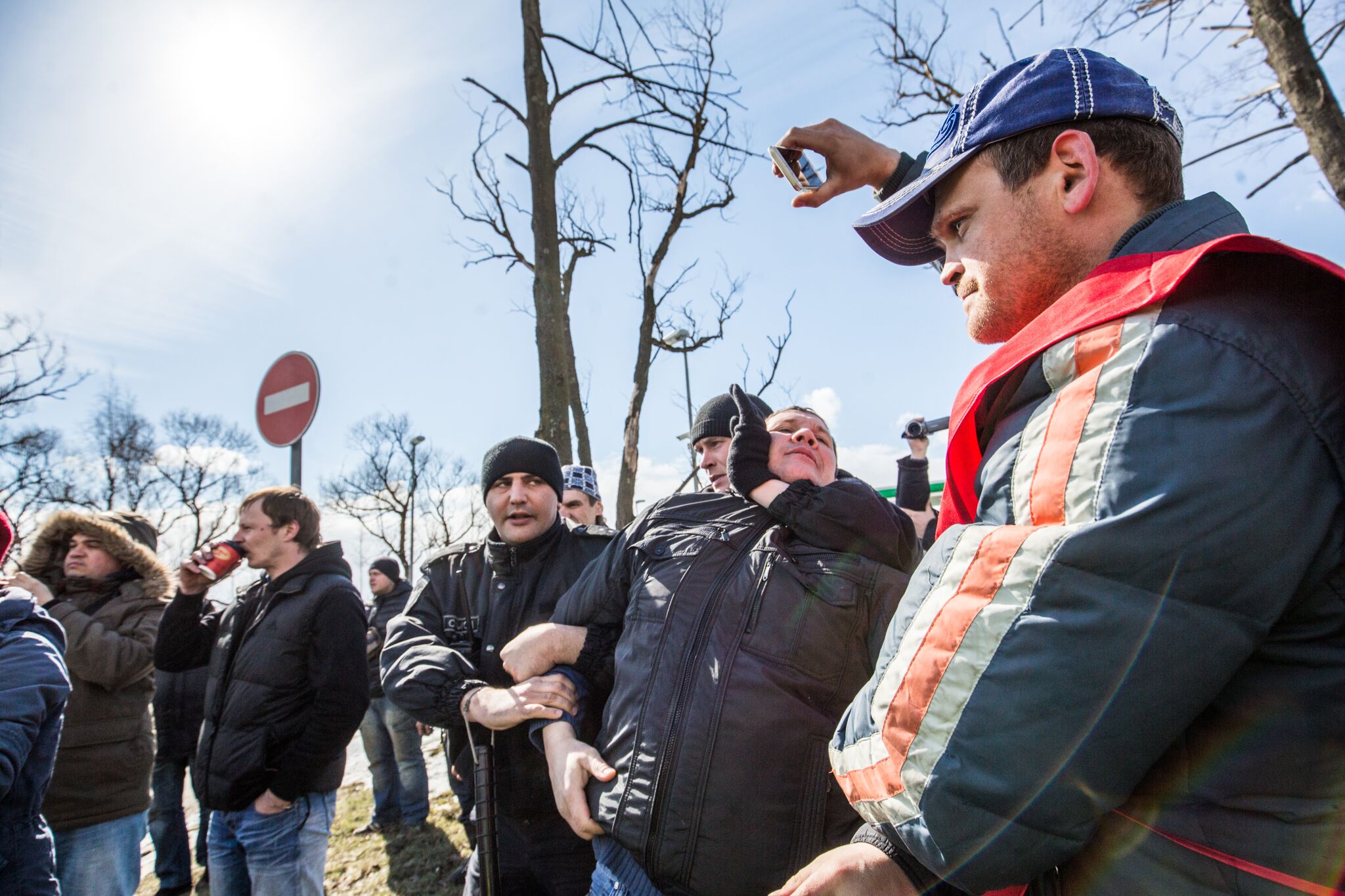 По его словам, у полицейских произошел конфликт с одним из участников акции, который усомнился в предоставленных ими документах. Мужчину увели в машину на 15-минутную беседу, в ходе которой его товарищи окружили полицейский автомобиль. После того, как активист вышел из машины, его задержали; сцепившиеся дальнобойщики попытались его защитить, но в это время прибежали сотрудники Нацгвардии или ОМОНа и приступили к задержаниям.