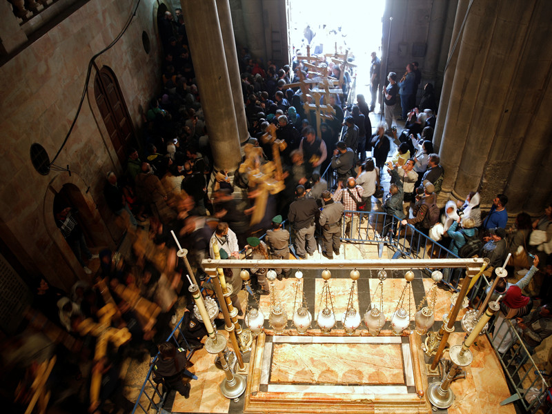 Десятки тысяч христиан со всего мира собрались в субботу на улицах Старого Иерусалима в ожидании Благодатного огня, который ежегодно загорается накануне православной Пасхи в Кувуклии - часовне над Гробом Господним в иерусалимском храме Воскресения Христова (Гроба Господня).