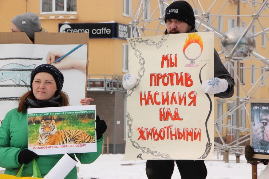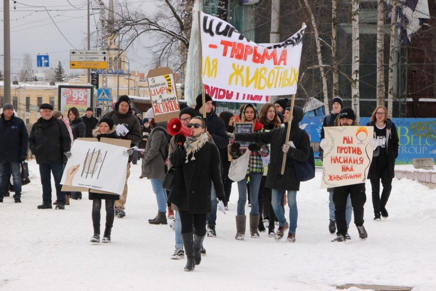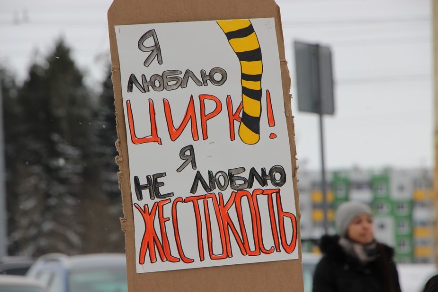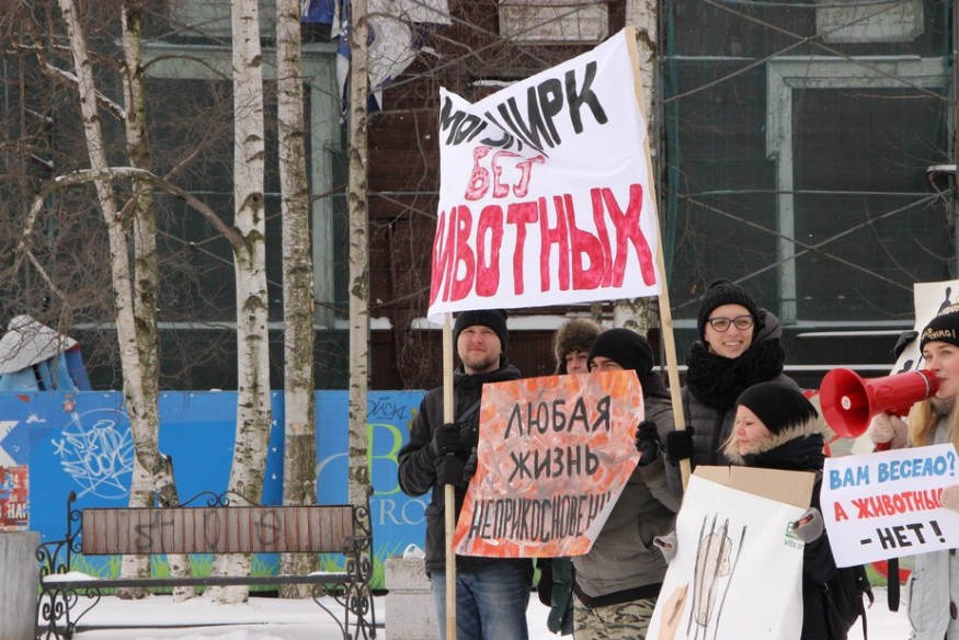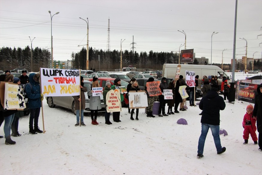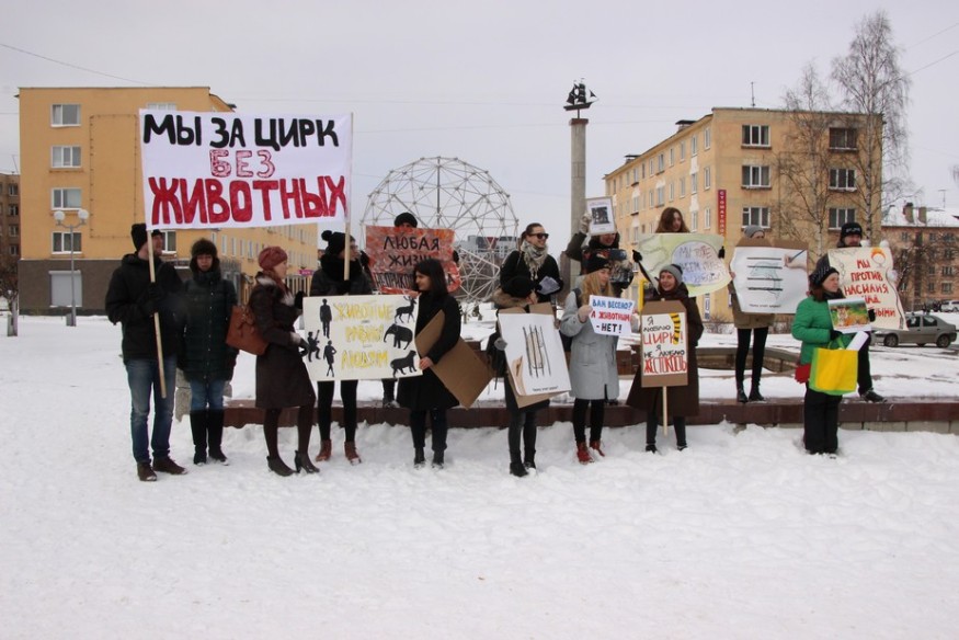 В столице Карелии 15 апреля, в Международный день цирка, прошел митинг «За цирк без животных». Акция состоялась перед очередным представлением гастролирующего цирка-шапито «Советский цирк». В труппе выступают не только акробаты и клоуны, но и многочисленные животные, в том числе верблюды, лошади, яки, обезьяны и бенгальские тигры.