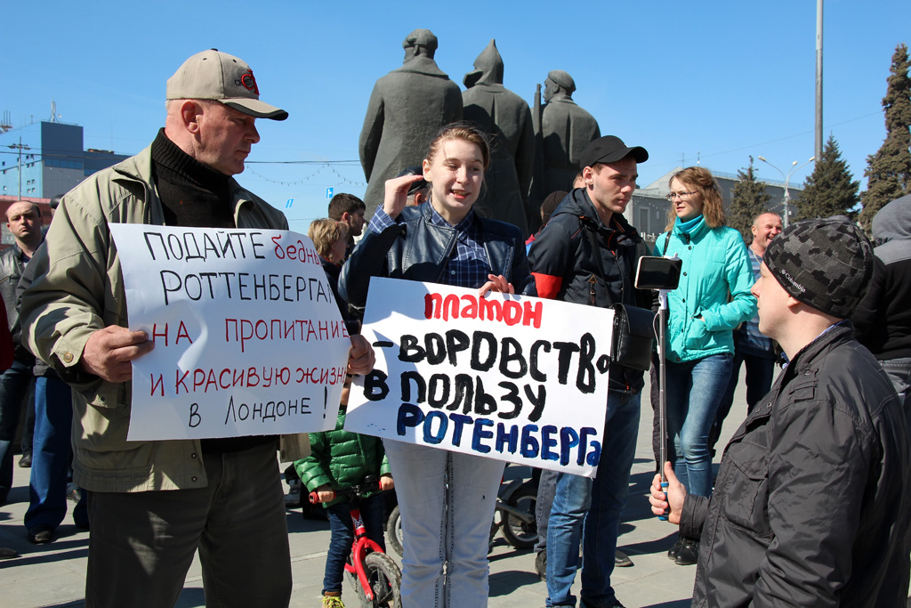 На главном баннере пикета было написано: «Платон не вывезем» и «Тормоз экономики! Акселератор цен!». Некоторые люди стояли с небольшими плакатами: «„Платон“ — воровство в пользу Ротенберга», «Подайте бедным Ротенбрегам на пропиатние и красивую жизнь в Лондоне».