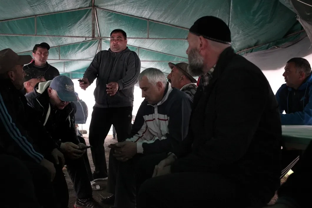 Одним из старейшин лагеря называют Тотраза Мамукаева, ему 52 года. Он сидит под шатром, лысина, усы жесткой щеткой, строгий взгляд. Его стаж — 35 лет.