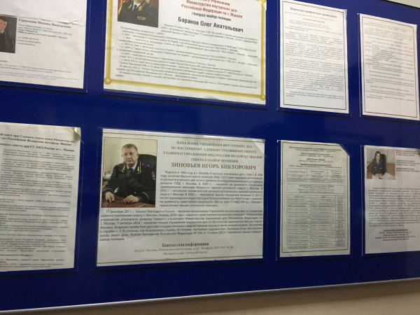 Контакты ОНК, Уполномоченных по правам человека в Росси и в Москве, Общественных Советов при УВД ВАО и ГУ МВД по г. Москве имеются. Контакты участковых уполномоченных полиции не вывешены.