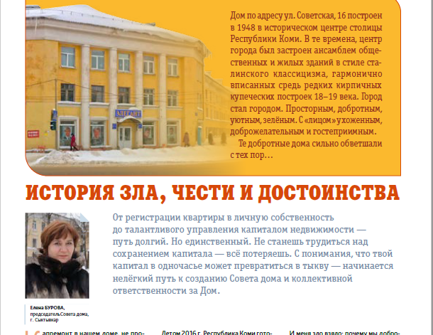 Опыт председателей состоявшихся объединений собственников, собранный под одну крышу в журнале «Председатель ТСЖ» бесценен для тех, кто только начинает путь Собственника. Надпись на обложке журнала - «Теперь и для Советов МКД» обнадёживает, поскольку создание Совета дома - это всего лишь первый перевал на пути к вершине-Товариществу собственников. До «сути Собственника» -гордости за свой Дом, до уважения к себе и обоснованному чувству собственного достоинства надо ещё дошагать.
