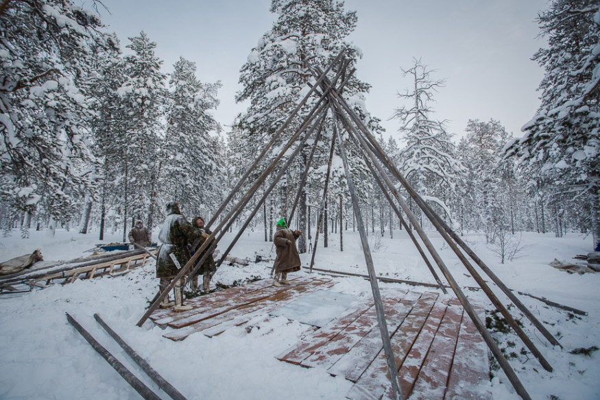 Сопочины ничего не подписали, но работы уже начались. Прямо по пастбищу проложили дорогу. В конце марта туда, за 30 километров, начинают перегонять оленей. Там же происходит отел. Сопочины поставили около чум – демонстративно, как акцию протеста. Однако нефтяники, судя по всему, не впечатались. Кстати, в реальном хозяйстве используются сейчас, как правило, деревянные избушки, а не чумы.
