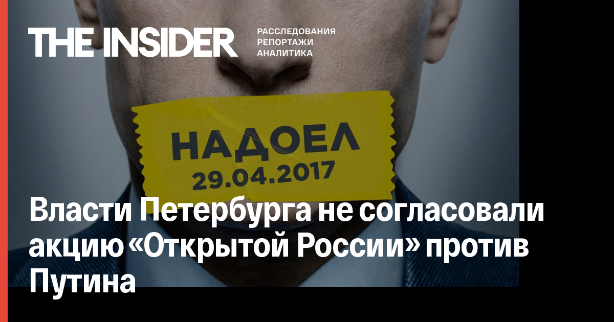 Власти Петербурга не согласовали акцию движения «Открытая Россия» «Надоел» против Владимира Путина, запланированную на 29 апреля. Об этом рассказал координатор петербургского отделения «Открытой Россия» Андрей Пивоваров, передает «Дождь».