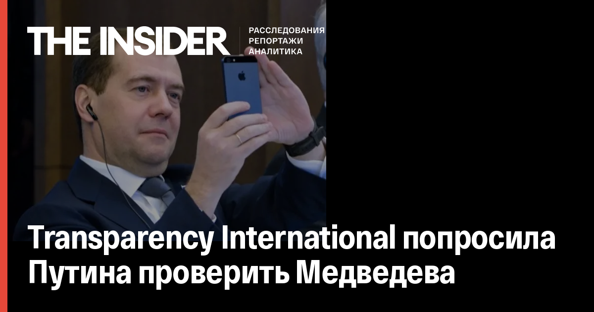 Российское подразделение международной организации Transparency International обратилось к президенту Владимиру Путину с просьбой проверить соблюдение антикоррупционного законодательства премьер-министром Дмитрием Медведевым по фактам расследования Фонда борьбы с коррупцией, сообщает РБК.
