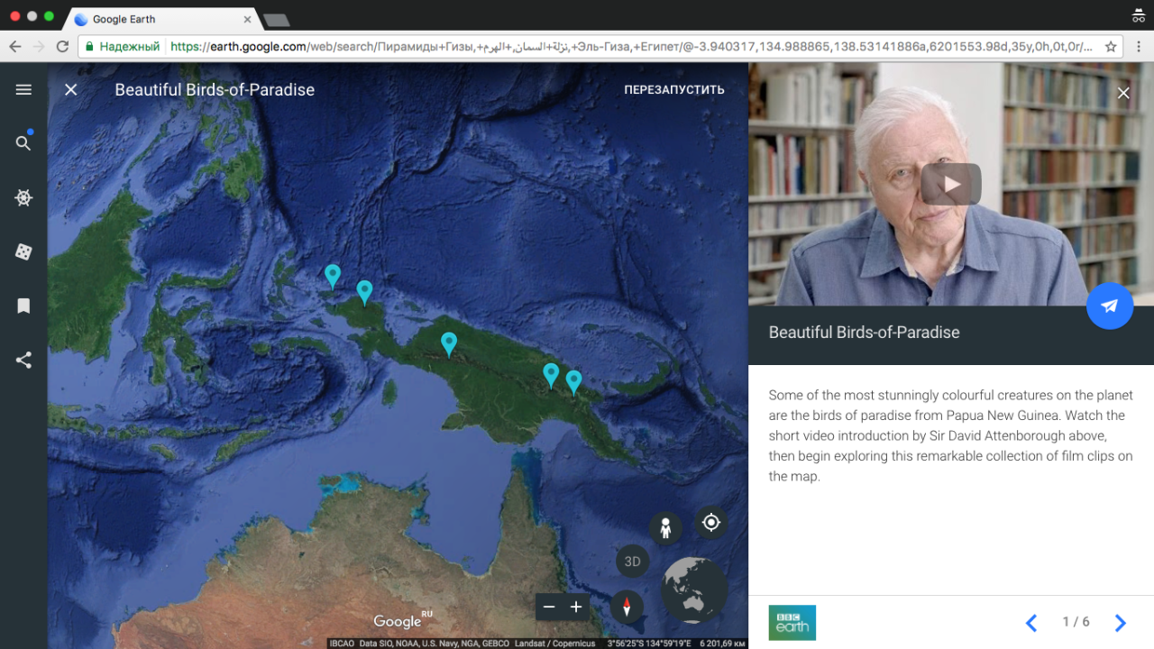 А некоторые туры в режиме «Исследователя» — наподобие сделанного в сотрудничестве с «Би-би-си» материала «Красивые райские птицы» — сопровождаются видеороликами с рассказами экспертов.