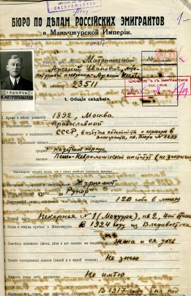 Арсений Несмелов (Митропольский) родился в 1889 году в Москве. В 1920-м оказался во Владивостоке, где начал печататься в газетах под псевдонимом Несмелов, который взял в память о погибшем друге. В 1924 году он переправился через Амурский залив и пешком пошел в Китай.