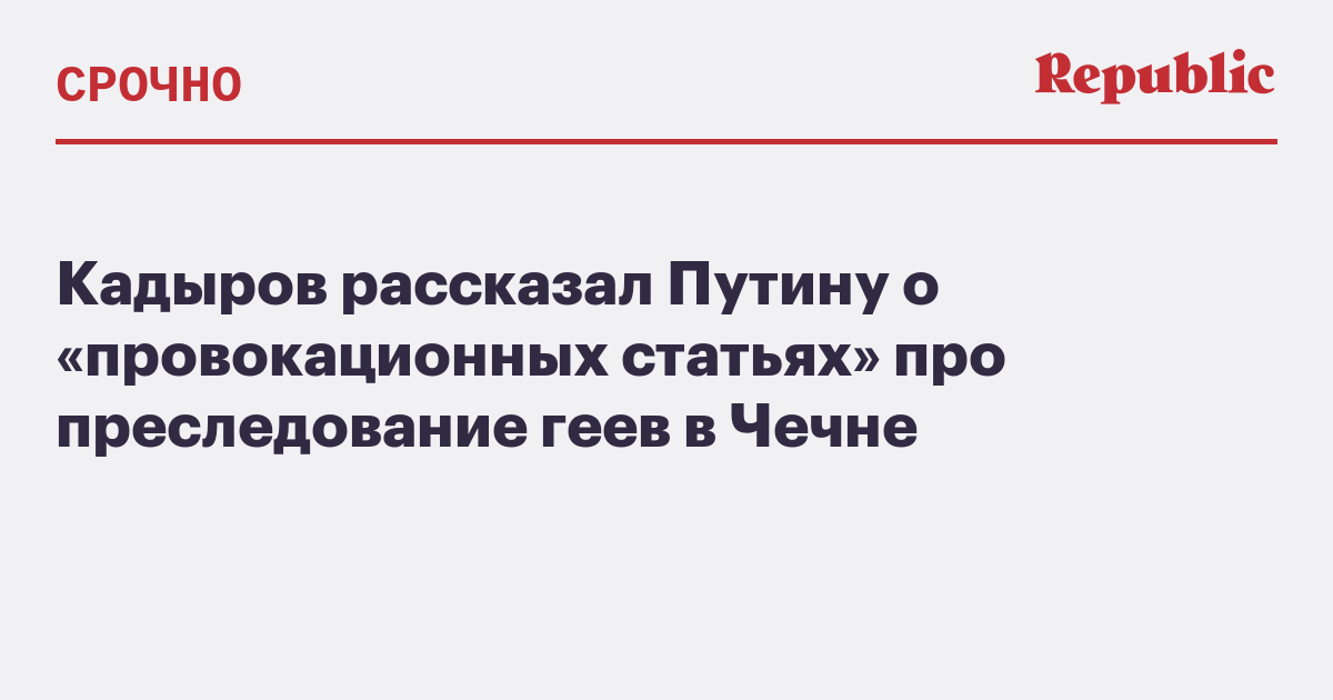 Глава Чечни Рамзан Кадыров на встрече с президентом России Владимиром Путиным заявил о «провокационных статьях» о преследовании гомосексуалов в Чечне, передает «Интерфакс».