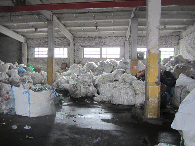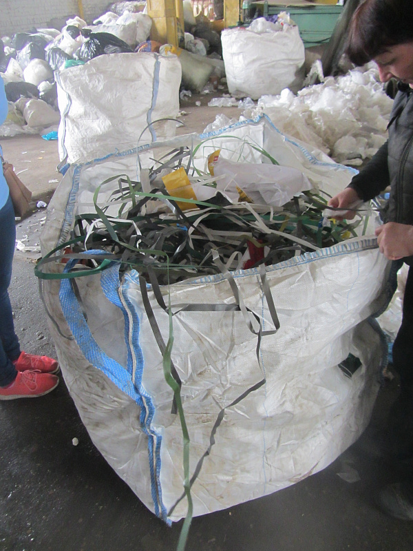 Пластмассовые изделия приобретают несколько мелких ИП, подвергающих пластмассовые изделия измельчению, а затем сия пластмассовая крошка идет как наполнитель для изготовления асфальтовой смолы, синтетических покрытий, шин и т. д.Первым объектом нашей экскурсии является цех полиэтилена, где мы наблюдаем следующую картину. На бетонном полу в разных углах помещения уложены мешки с различным содержимым. Со слов Валентины Николаевны узнаем, что не всякий полиэтилен годится в переработку. Не подходит, например, грязный полиэтилен или чересчур уж разорванные изделия. Их откладывают отдельно и вывозят на полигон. Так что предприятие по переработке отходов тоже имеет отходы! Все остальное прессуется в блоки и отгружается потребителям! При нас подъехал огромный дальномер с украинскими номерами под загрузку такими блоками.