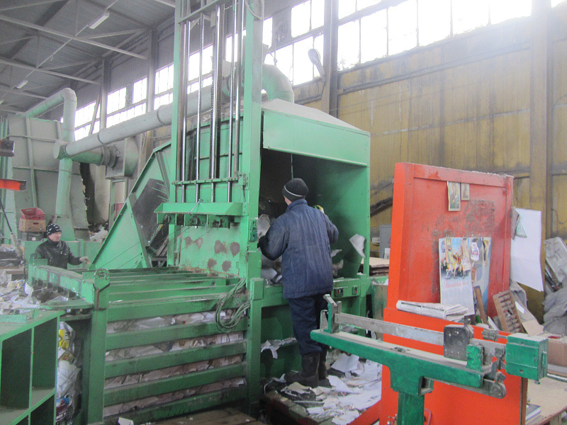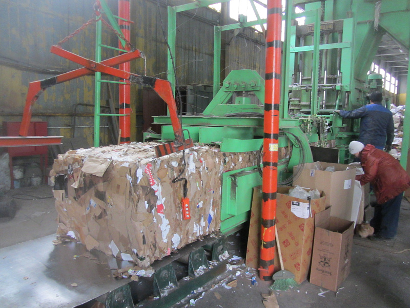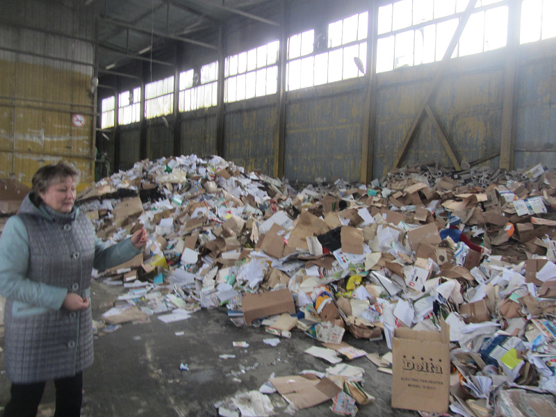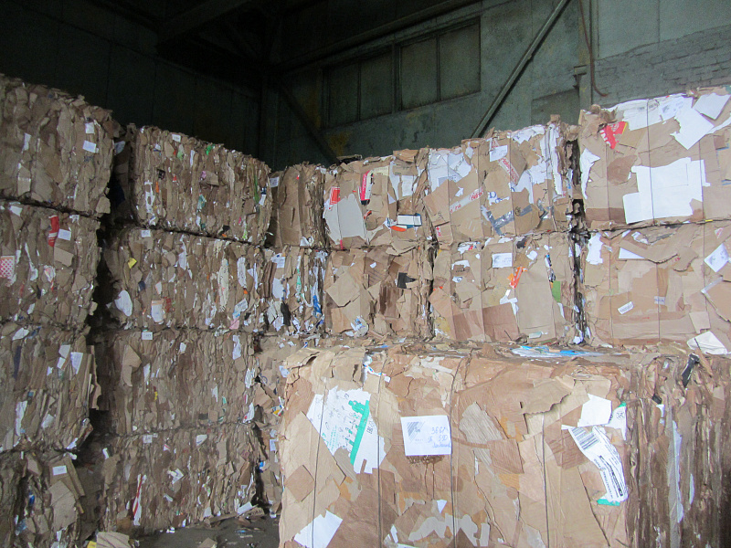 Тут же мы сдаем принесенную с собой макулатуру. Её оказалось четыре килограмма.Разбор макулатуры ведется вручную по принципу цвета и плотности бумаги. Затем бумага измельчается в специальных бункерах и прессуется в блоки наподобие тех, что мы видели в цехе полиэтилена. Картон сортировался и прессовался по тому же принципу в соседнем помещении.На открытой площадке нам показали рассортированные по принципу материала, из которого они изготовлены, деревянные и пластиковые ящики и горы стеклотары, разобранной в зависимости от размера и цвета стекла.