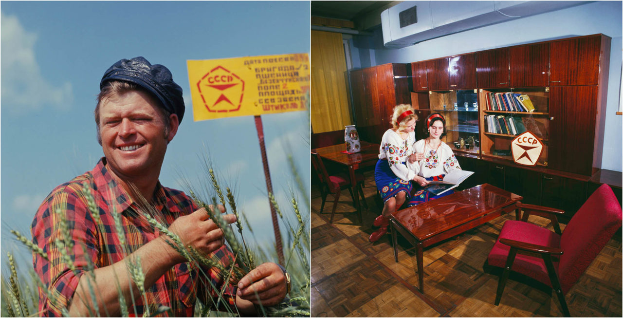Слева: Казахская ССР. 1978 г. Совхоз «Заветы Ильича». Передовой бригадир совхоза Валентин Шкурнов. Справа: Украинская ССР. 1978 г. Житомирский мебельный комбинат. Продукция комбината — набор мебели «Житомир»Фото: Иосиф Будневич, Владимир Медведев; П.Бойко/ТАСС