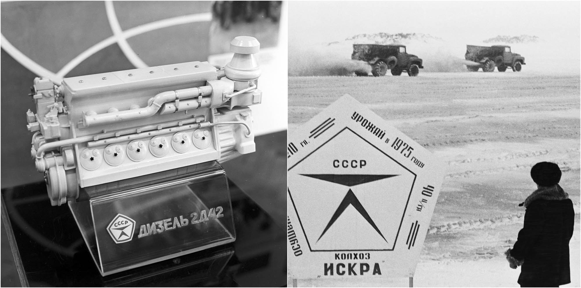 Слева: 1971г. Дизель «2Д42» — экспонат музея Коломенского тепловозостроительного завода. Справа: Новгородская область. 1976 г. Знак качества, установленный на поле колхоза «Искра»