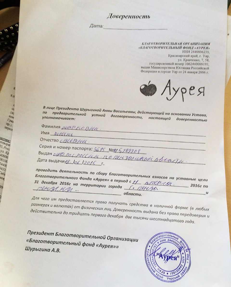 На следующий день Шарипков и его коллеги по «Гражданскому союзу», вооружившись информацией, которую можно было прочитать на ящиках для сбора денег, попытались выяснить подробности. Выяснилось, что официальное название благотворительного фонда — «Аурея», а зарегистрирован он в Красноярском крае, в городе Уяр. Ребенок, на лечение которого собирали деньги «гражданские активисты», при этом жил за тысячи километров от Красноярска — в Краснодарском крае; в интернете обнаружилось сразу несколько фондов, которые искали для него средства. «Зарегистрированы в Красноярском крае, деятельность ведут в Пензе, собирают деньги на больных детей где-то в Краснодаре. Для чего? Чтобы ничего нельзя было проверить, — объясняет Шарипков. — Я называю это гибридной благотворительностью — видимость законности, а на самом деле все работает полностью вне правового поля».