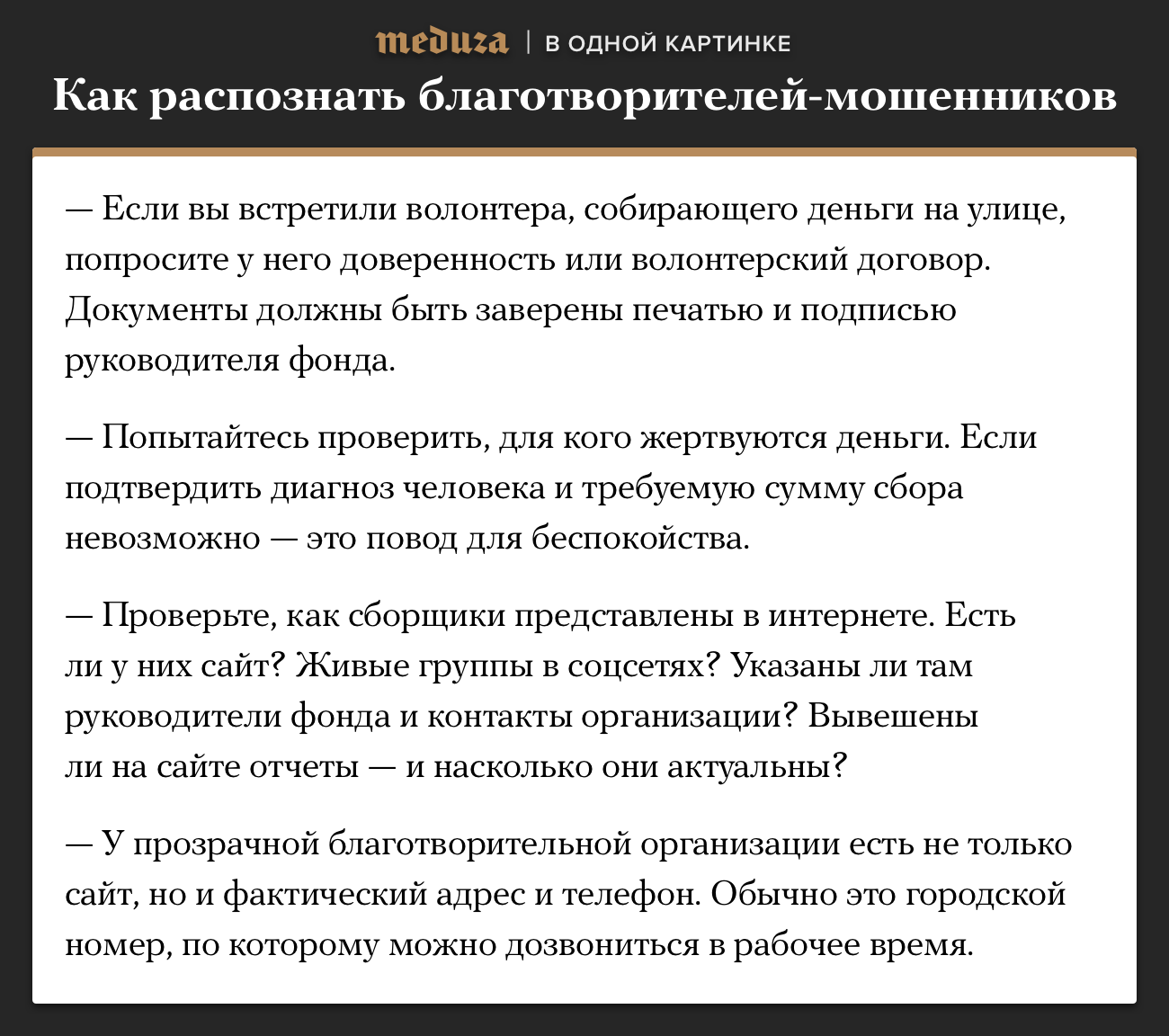 Как настоящие благотворительные организации борются с ненастоящими — и почему у них не всегда получается. Репортаж «Медузы»