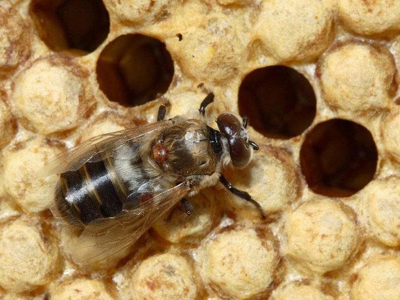 Клещ варроа на пчеле Wikimedia Commons Современные медоносные пчелы страдают от многочисленных угроз, самая серьезная из которых – распространение паразитического клеща варроа деструктора (Varroa destructor). Латинское название, означающее «разрушитель», он получил из-за гибельного действия на пчелиные семьи.
