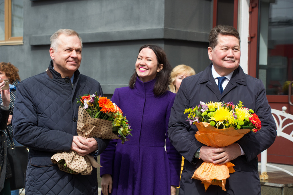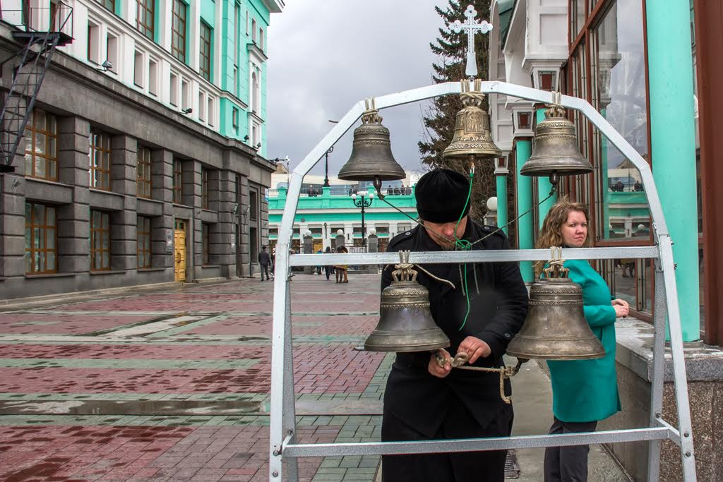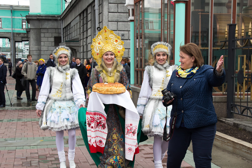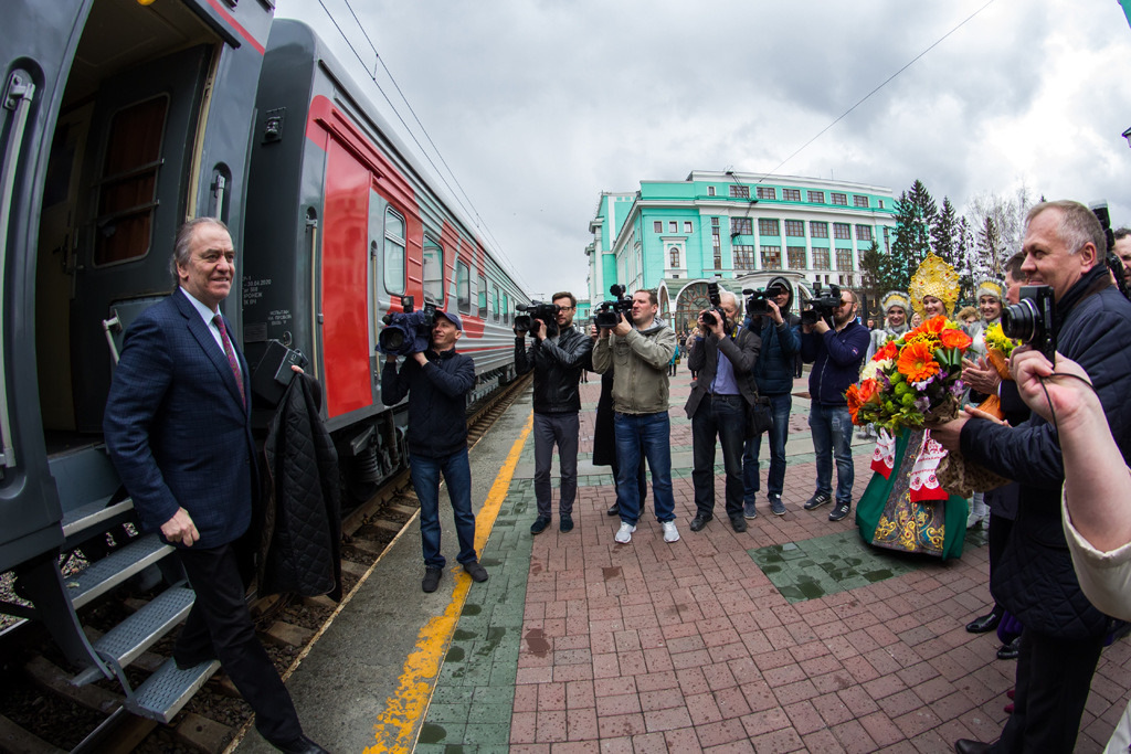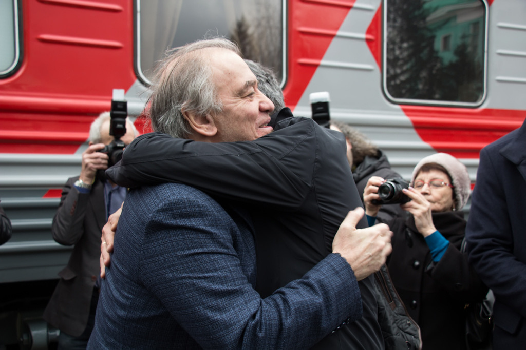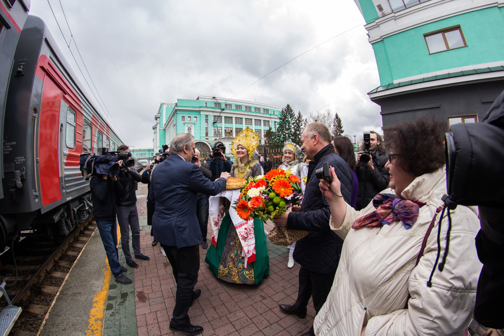К приезду поезда на перроне вокзала Новосибирск-главный выстроились полпред президента в Сибири с охраной, министры культуры Новосибирской области и Красноярского края Игорь Решетников и Елена Мироненко (которая оказалась в командировке), гендиректор Новосибирской филармонии Бейбит Мухамедин, девушки в кокошниках с караваем, а также мобильная звонница с колоколами.