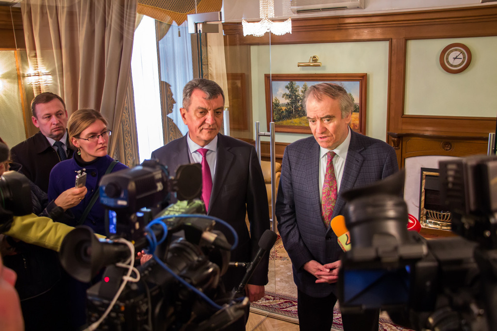 Перезвон успел прозвучать дважды, прежде чем вышел обрадованный Гергиев. Он дважды откусил от каравая, принял цветы у новосибирского министра и обнялся с Меняйло. «Мы работали, и я не заметил, как приехали», — признался маэстро. Потом были парные пресс-подходы в исполнении полпреда и дирижера, а также двух министров культуры.