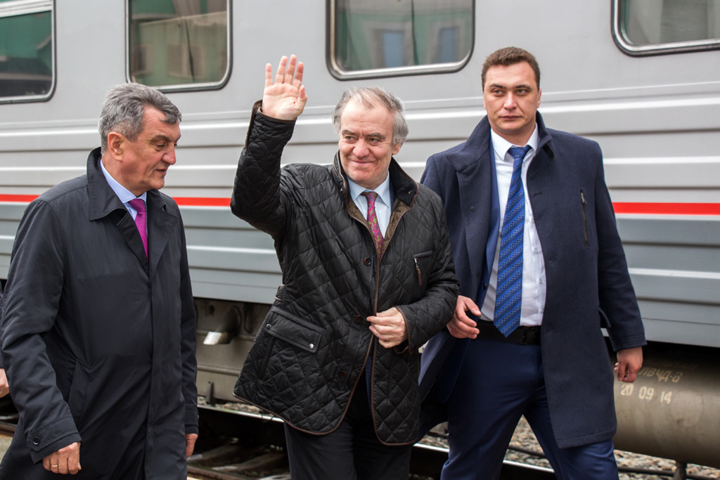 В Новосибирск прибыл личный поезд дирижера Валерия Гергиева и оркестра Мариинского театра. На перроне его встретила представительная делегация из полпреда президента Сергея Меняйло, министров культуры двух регионов и других чиновников. Музыканты проведут 24 апреля два концерта в рамках Московского Пасхального фестиваля.