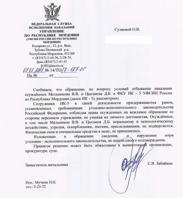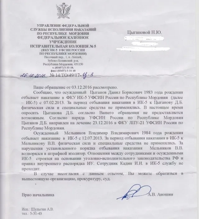 Из ответа начальника ФКУ ИК-5 Аношина А.В. Наталье Цыгановой: «За период отбытия наказания в ИК-5 к Цыганову Д.Б. физическая сила и специальные средства не применялись. <…> За период отбытия наказания в ИК-5 к Мельникову В.В. физическая сила и специальные средства не применялись. <…> Отношения между сотрудниками и осужденными ИК-5 строятся на основании уголовно-исполнительного законодательства РФ и правил внутреннего распорядка исправительного учреждения».