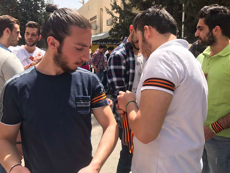 Как сообщает РИА "Новости", "патриотическая акция "Георгиевская ленточка" впервые стартовала на территории Дамасского государственного университета". Она была организована бюро МИА "Россия сегодня" в Дамаске совместно с Центром по примирению враждующих сторон в Сирии и Союзом студентов Сирии.