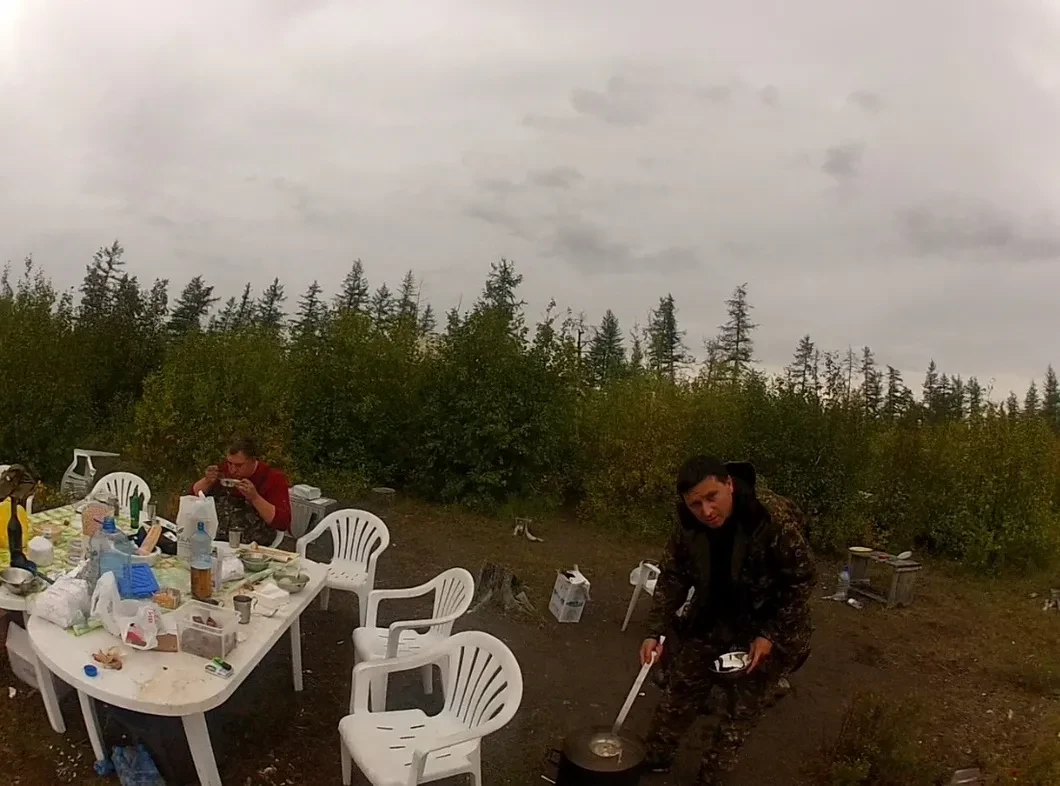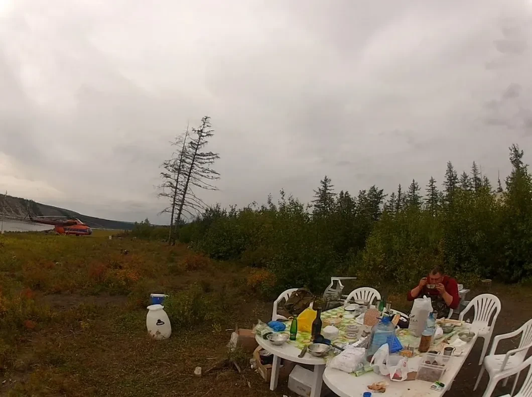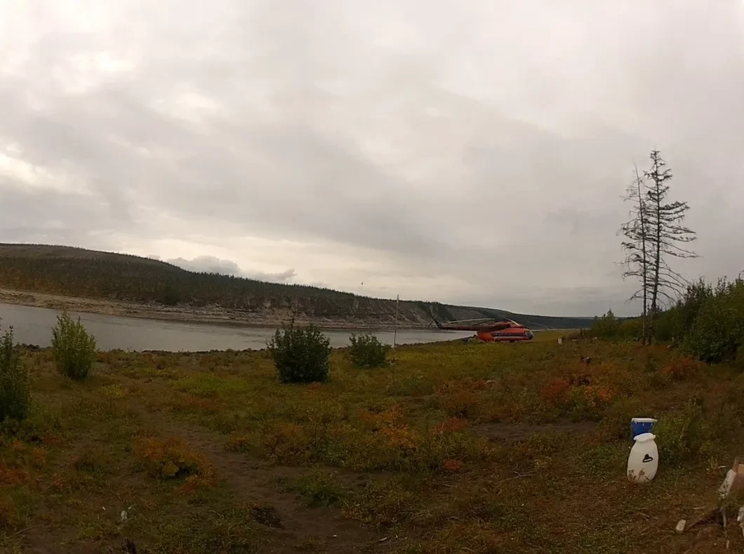 В видеозапись приготовления ухи снова попал вертолет. Что интересно, это вертолет с характерной красно-синей раскраской авиакомпании «Таймыр».