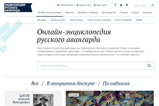 Начал работу интернет-ресурс, созданный на базе трехтомной «Энциклопедии русского авангарда». На нем доступны более 1200 статей, в подготовке которых приняли участие более двухсот отечественных и зарубежных специалистов по авангарду.