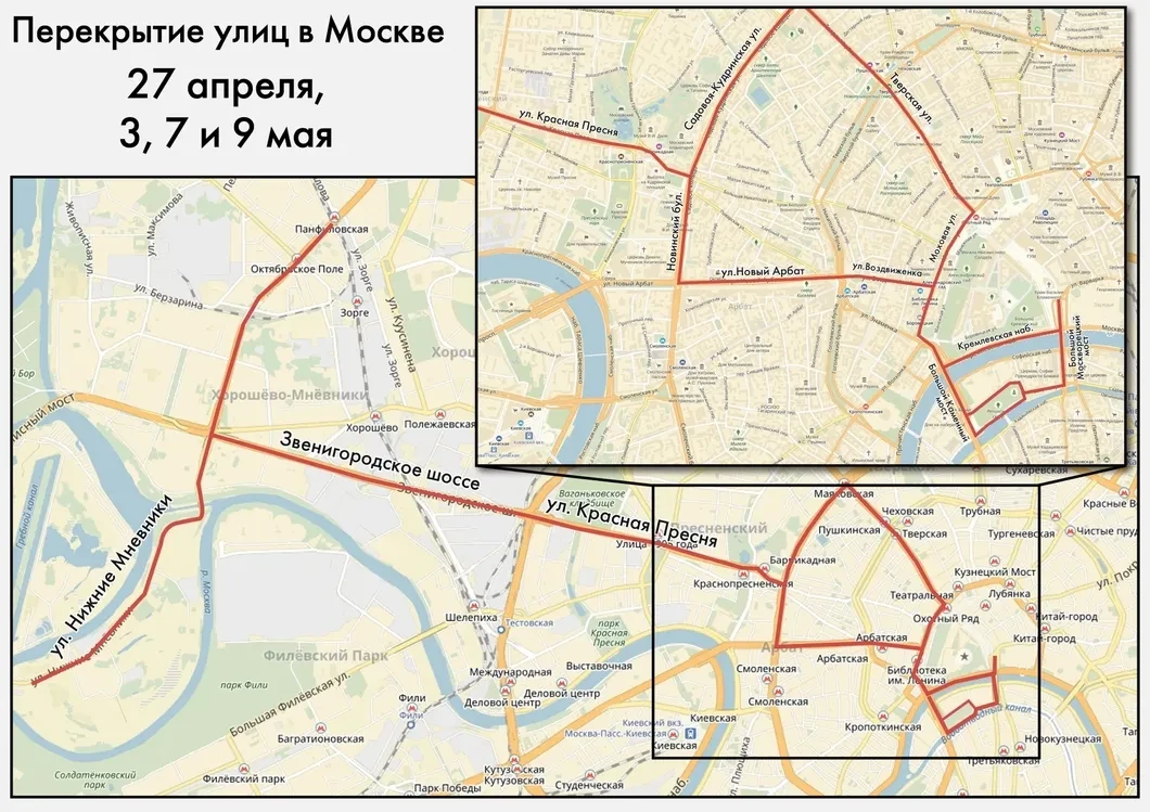 Движение будет ограничено по маршруту прохождения военной техники: от ул. Нижние Мневники — ул. Народного ополчения — ул. Мневники — Звенигородское шоссе — ул. Красная Пресня — ул. Баррикадная — ул. Садовая-Кудринская — ул. Большая Садовая — Триумфальная площадь — ул. Тверская — Кремлевская набережная — Боровицкая площадь — ул. Моховая — ул. Воздвиженка — ул. Новый Арбат — Новинский бульвар — ул. Садовая-Кудринская — ул. Тверская; Красная площадь — Большой Москворецкий мост — ул. Болотная — Болотная площадь — Большой Каменный мост.