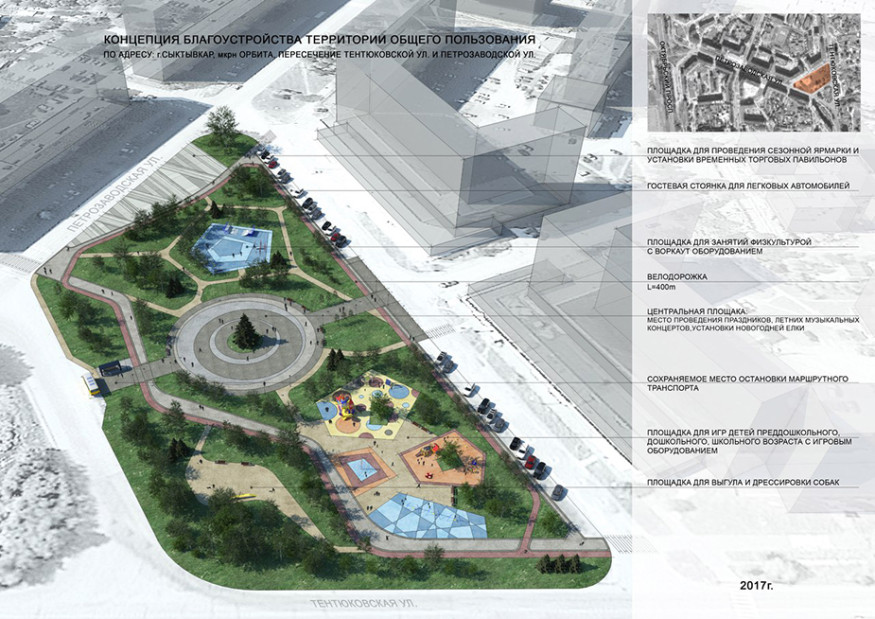 В конце марта 2017 года началась застройка площадки на пересечении улиц Тентюковская и Петрозаводская. Право аренды площадки принадлежит компании «Ассорти плюс». По неподтвержденной информации, работы будет проводить компания «ТетрастройКоми». Площадка является традиционным местом отдыха и проведения новогодних и других праздников для жителей микрорайона Орбита. В середине апреля инициативная группа местных жителей провела собрание рядом с местом, где планируется построить парковку.