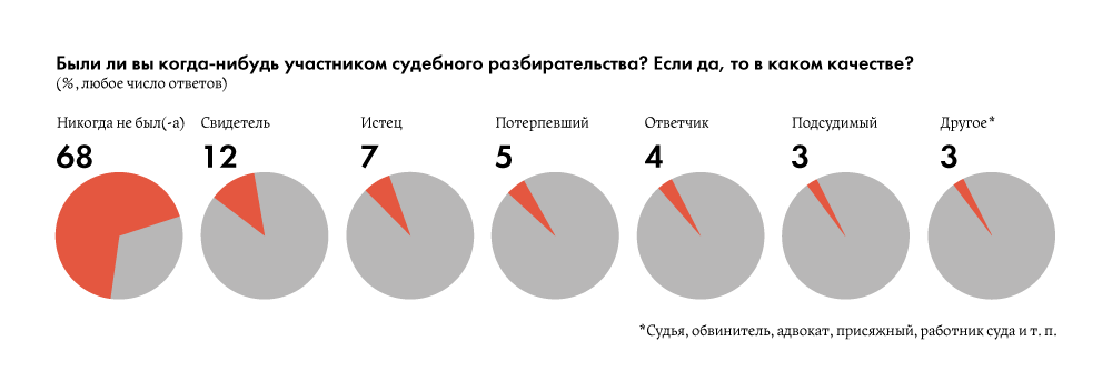 Но если мы теперь вернемся к социологическим опросам, то увидим, что там 68% взрослых признаются, что никогда в жизни в суде не бывали. Как же так? Каждый десятый бывает лично в суде каждый год, при этом семь из десяти никогда в суде не были?