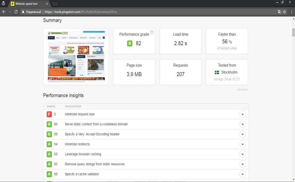 Время загрузки и отклика сайта также влияет на выведение вашего сайта вверх поисковой системой. Для того чтобы определить время загрузки сайта, перейдите на сервис Pingdom и введите URL сайта. Если тест проводиться из России, тогда стоит выбрать запрос, например, из Швеции, чтобы результат получился точнее.