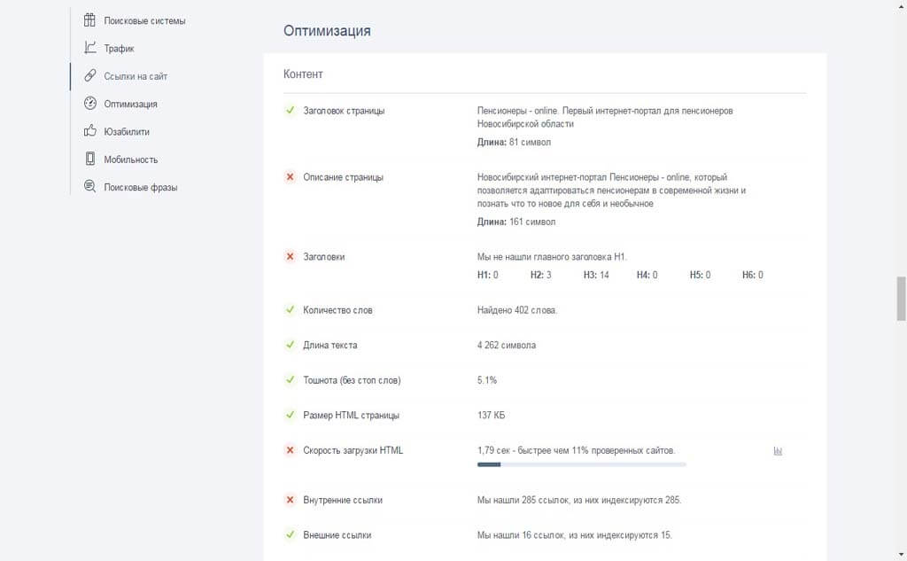Важной частью для поисковой оптимизации является контент сайта, а также то, насколько хорошо прослеживается тематика сайта и информация на нем. На сайте PR-CY вы можете проверить контент вашего сайта и узнать, все ли ссылки работают, насколько доступна мобильная версия, каков трафик. Важные показатели – плотность ключевых слов, релевантность, определение тематики сайта.