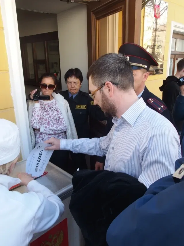 В 13.50 член регионального совета «Открытой России» Дарья Кулакова поставила на тротуар неподалеку от дверей приемной пластмассовый ящик для обращений. Прибывшая заблаговременно полиция попросила ящик убрать и, к удивлению собравшихся, предложила открыть дверь приемной (в субботу и воскресенье она не работает) и сдавать обращения непосредственно туда. Подполковник полиции позвонил в дверь, из приемной вынесли урну с двуглавым орлом, и все желающие опустили свои конверты в прорезь. Урну унесли, дверь закрыли.