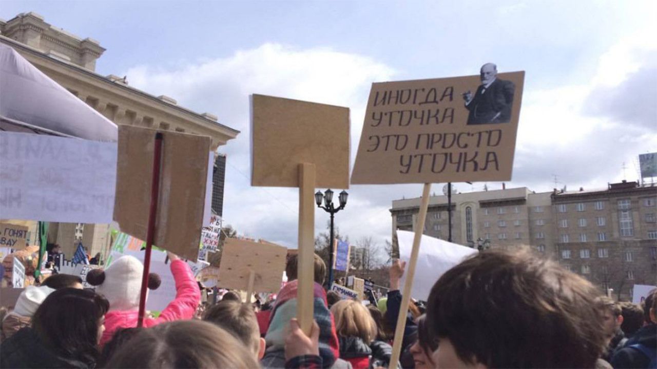 В Новосибирске состоялась «Монстрация» — шествие с абсурдными лозунгами, которое традиционно устраивают 1 мая. По оценкам городских властей, в нем приняли участие около трех тысяч человек. «Медуза» показывает лучшие лозунги, с которыми «монстранты» прошли по главному проспекту Новосибирска.