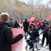 За ретро-автомобилями дюжина молодых людей (комсомольцы) несла большой красный флаг, обращенный в небо. Наверно к Богу, который для коммунистов не существовал сто лет, а теперь снова воскрес.