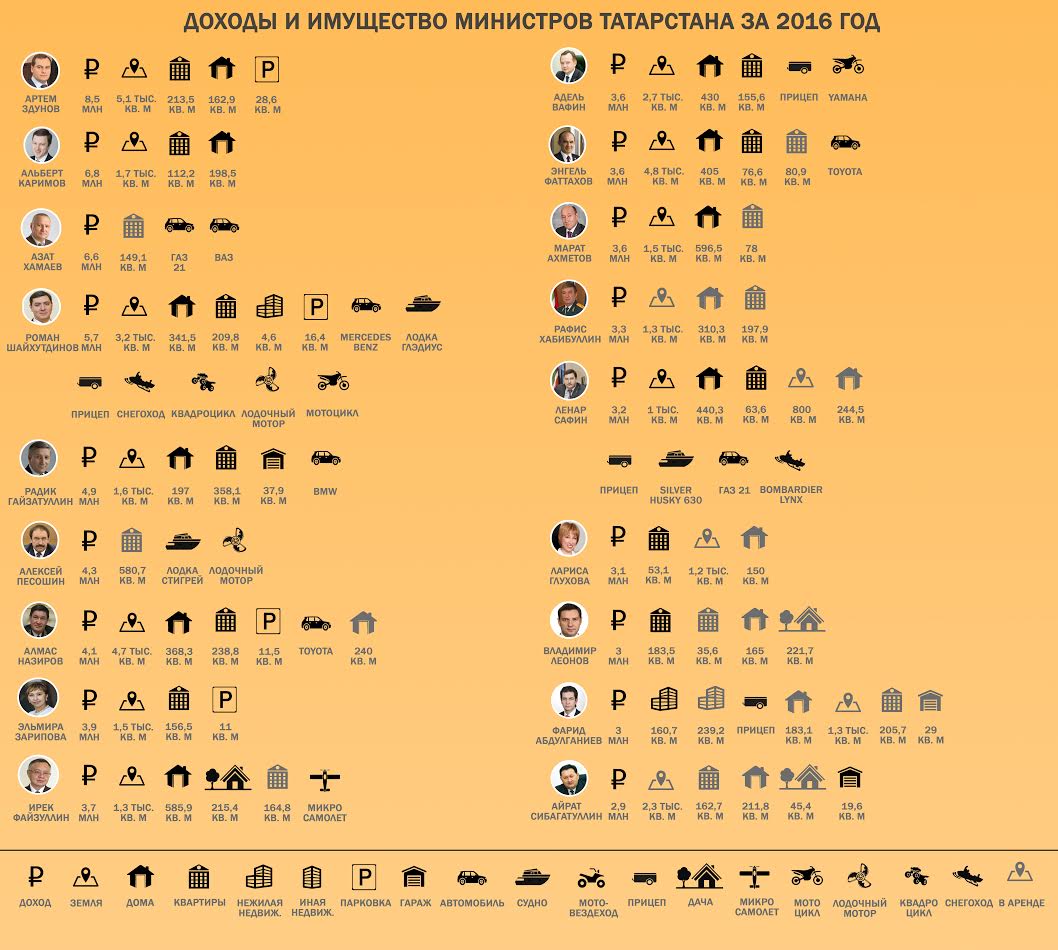 На сайтах министреств Татарстана появились декларации о доходах и имуществе министров. В общей сложности они заработали в прошлом году 77,8 млн рублей. Самым "богатым" стал министр экономики Артем Здунов, который задекларировал 8,5 млн рублей, вторую строчку занял министр промышленности и торговли Альберт Каримов с 6,8 млн рублей, а третьим по уровню дохода стал министр земельных и имущественных отношений Азат Хамаев, заработавшей 6,6 млн рублей. Доходы и имущество министров – в инфографике "Idel.Реалии"