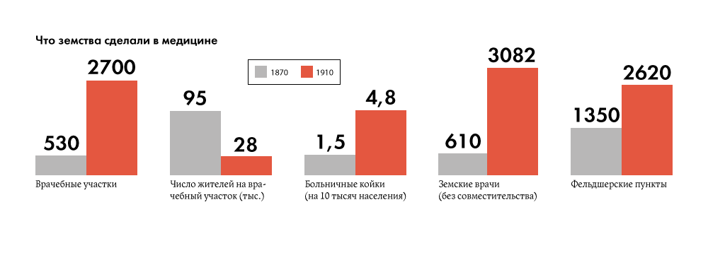 Источник: Веселовский Б.Б., История земства за 40 лет; Френкель З.Г., Очерки земского врачебно-санитарного дела К концу 1900-х радиус врачебного участка сократился до 17 верст, на одного врача приходилось 28 тысяч, а на больничную койку — примерно две тысячи жителей. Конечно, это очень мало. Сегодня в Москве, например, эти показатели на порядок больше: на участкового терапевта приходится порядка трех тысяч, а на койку — примерно 200 человек. Но ведь мы и живем в другом веке. Стоит помнить, что именно земства сделали врачебную помощь частью повседневной жизни для миллионов жителей страны.