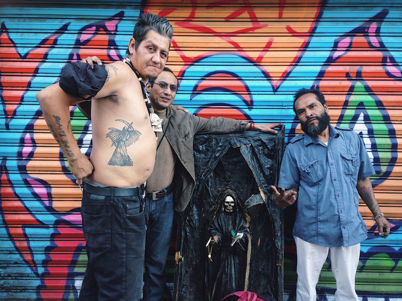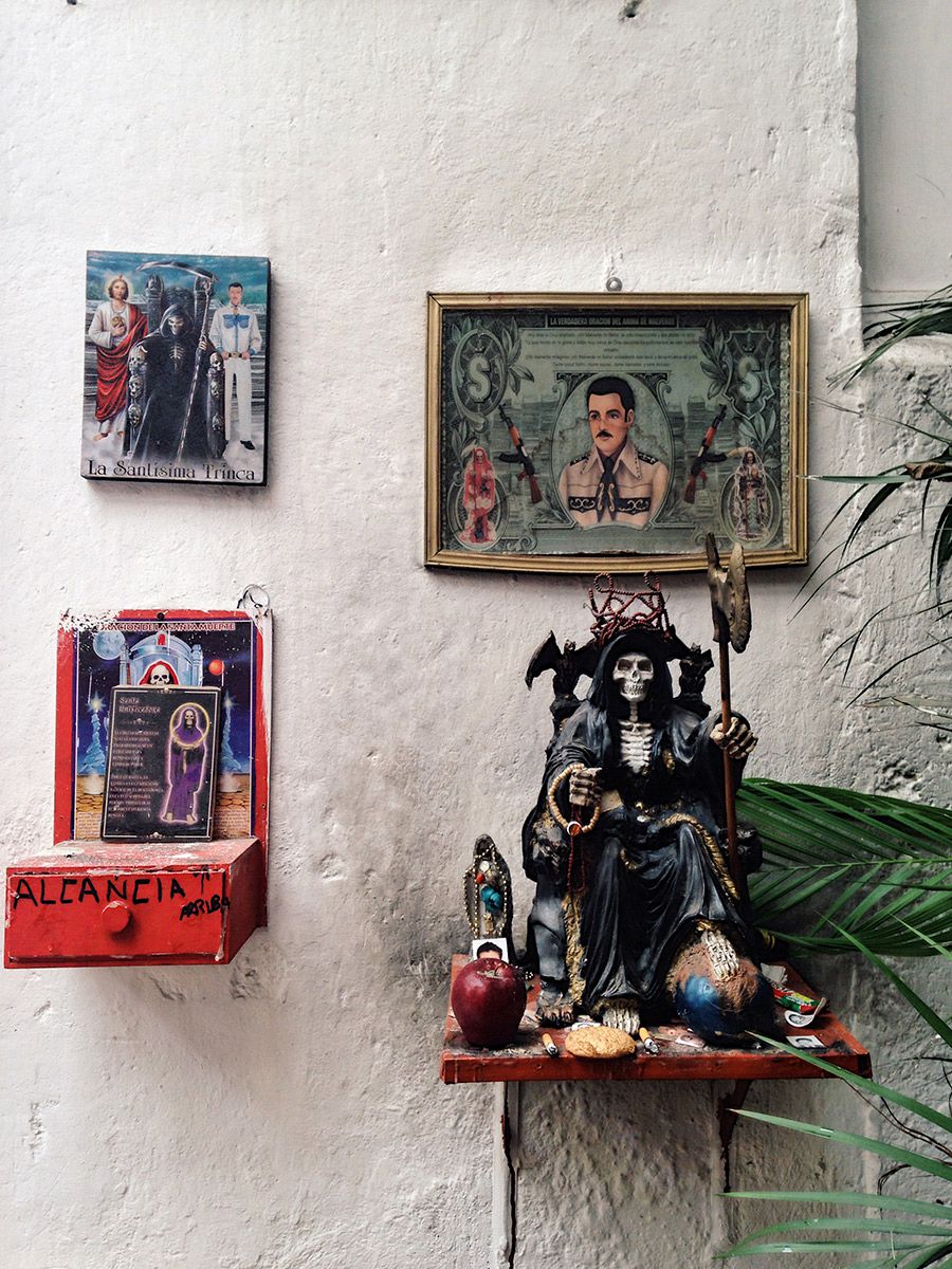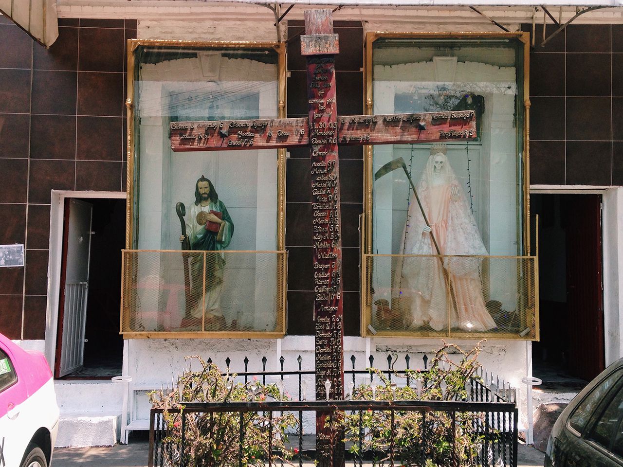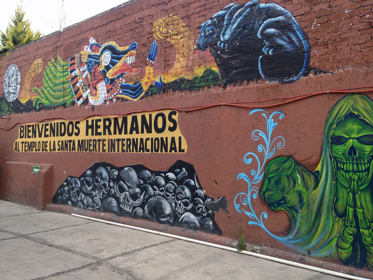 Вход в святилище Санта Муэрте — через сувенирную лавку. Сам храм находится на свежем воздухе: по периметру его обрамляет частокол алтарей со скелетами, одетыми в пышные викторианские наряды различных цветов, а венчает эту процессию чёрная Санта Муэрте Гиннесса с руками, дружелюбно расправленными для объятий. Стена за спиной у гигантской статуи покрыта замысловатыми рисунками: взгляд приковывает портрет какого-то рэпера в белом пиджаке, похожего на тультитланского Паффа Дэдди. Он, как и статуя, стоит с расправленными руками, а сзади на него, кажется, бросается пантера. Среди других персонажей на стене также изображены две вариации Святой Смерти, в стиле ранних Wu Tang Clan, и женщина в головном уборе из розовых перьев. Рисунки на других стенах отсылают в дохристианскую историческую эпоху: шаманы с головами диких кошек, тотемы из черепов, пернатая змея Кецалькоатль — одно из главных божеств ацтекского пантеона.