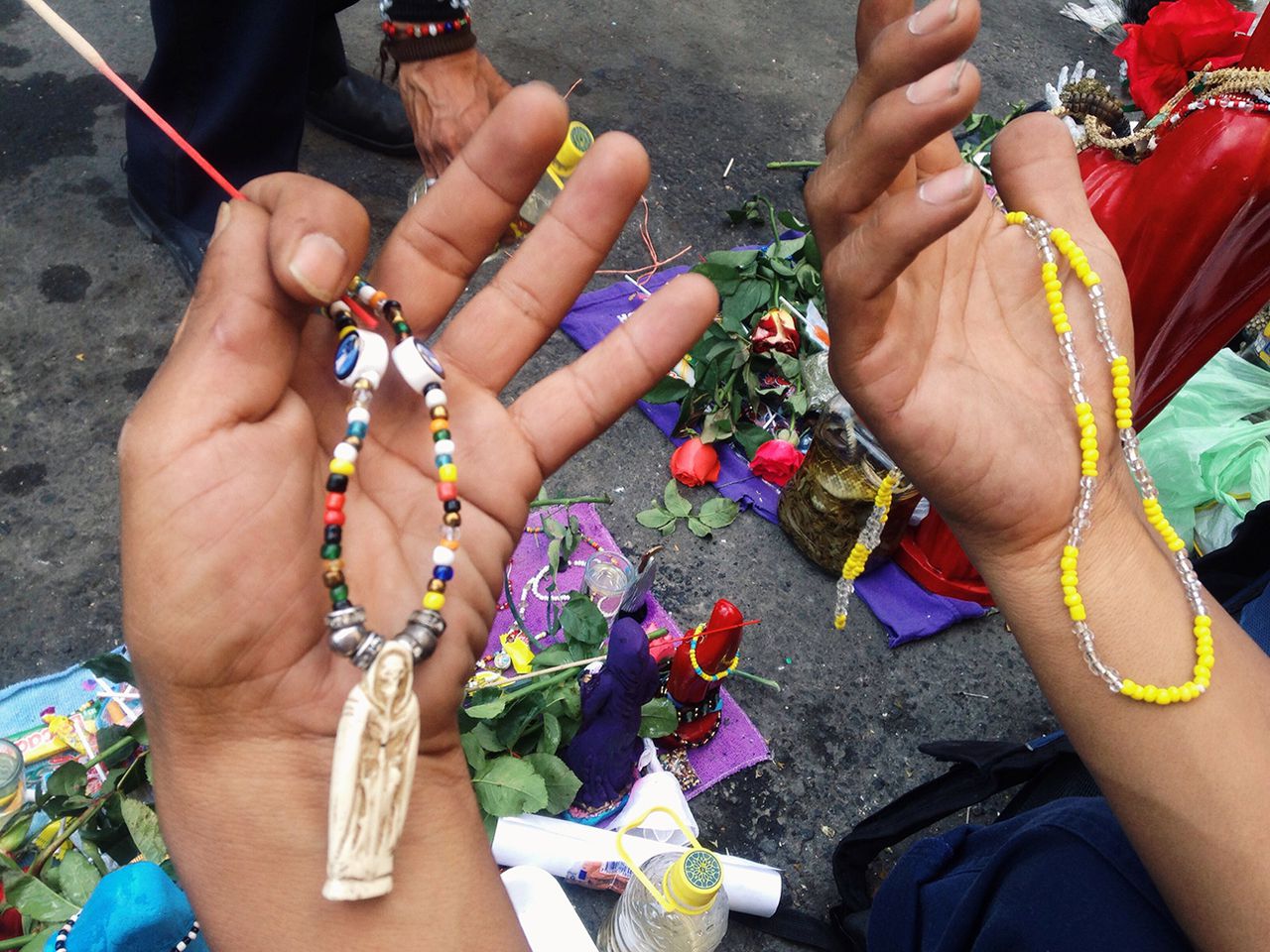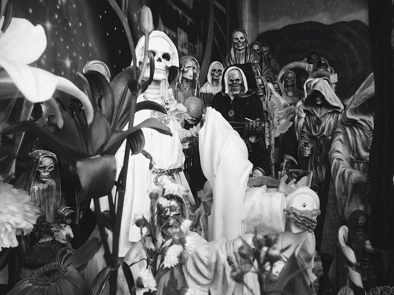Другой апологет культа, шестидесятичетырёхлетний блюз-музыкант Рубен Гарсия, говорит, что у Святой Смерти он просит лишь покоя: «Люди боятся не смерти как таковой, а умереть недостойно. Если бы у каждого была возможность умереть безболезненно, с улыбкой на лице, разве смерти бы боялись?» Рубен, как и многие последователи культа, пришёл к Святой Смерти в момент отчаяния, когда многолетняя депрессия почти довела его до финального шага, однако этот шаг так никогда и не был сделан — спасла вера. Я спросила Рубена, знает ли он, насколько часты самоубийства среди приверженцев культа, убивают ли люди себя в жертву Святой Смерти. На что он ответил: «Католики и христиане только и думают о том, как бы спасти себя после смерти, мы же ищем спасение в самой жизни, просим у Санта Муэрте защиты и помощи, чтобы прожить наши жизни достойно. Я не знаком со статистикой, но если ты имеешь в виду массовые или идеологические самоубийства, как это случилось с Джонстауном*, то такого здесь не случается. Люди начинают верить в Святую Смерть, а через веру приходят к пониманию самих себя».