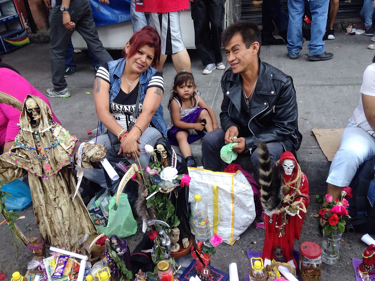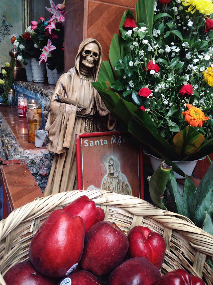 У одного из алтарей молодая женщина стоит на коленях, её маленькая дочь бегает поодаль. Двадцатитрёхлетняя Норма соглашается поговорить со мной о том, как Святая Смерть вошла в её жизнь: «Три года назад в мастерскую мужа пришёл посетитель, который рассказал нам о Белой Девочке. Конечно, поначалу было немного страшно: я выросла в семье ревностных католиков, но любопытство перебороло страх. Я тогда пришла в храм и попросила её выполнить одну просьбу, и она выполнила. С этих пор я каждые восемь дней приношу красные яблоки к алтарю в знак благодарности».