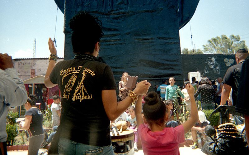 Фото: Adél Koleszár Внезапно все поднимаются со своих мест. Я вижу женщину лет пятидесяти, три элемента одежды которой составляет леопардовый принт — конечно, так должна выглядеть мать коменданта Пантеры! Сначала она собирает вокруг себя всех детей, обнимая и целуя каждого — Мэри Поппинс от Святой Смерти. Затем начинается официальная часть. Служба открывается словами: «Здесь нет ни военных, ни полиции, ни преступников, все здесь собравшиеся — братья друг другу». Кто-то протягивает мне подтаявшую шоколадную вафлю. Затем появляются музыканты с барабанами и морскими раковинами, Энрикета приближает микрофон ко рту испуганной девочки лет пяти, даёт знак, и та испускает истошный вопль «СААААНТААА МУУУУУУЭЭЭЭЭРТЕЕЕЕ». Музыканты наигрывают языческую мелодию, и эпизод с девочкой повторяется (четыре раза), затем крёстная мать просит Святую Смерть дать всем здоровья и сил. Я закрываю глаза и даю языческим мелодиям унести меня во времена императора Моктесумы Первого, который ещё не знает, что скоро к берегам его плодородных, свободных земель причалят корабли заносчивых колонизаторов. Они привезут свинину, и есть лысых собак станет уже не модно. Они привезут новые болезни, и даже убивать половину коренного населения не придётся. Они привезут католицизм, и все станут виновны. Всем станет стыдно, всем будет страшно. Праздники в честь Миктлантекутли, бога смерти в ожерелье из человеческих глаз, будут запрещены. Веселье будет отменено. Памятники будут разрушены. Еретики уничтожены. Музыка смолкает. До меня доносится разговор двух сеньор — они собрались вместе идти на службу в другую, теперь уже католическую церковь.